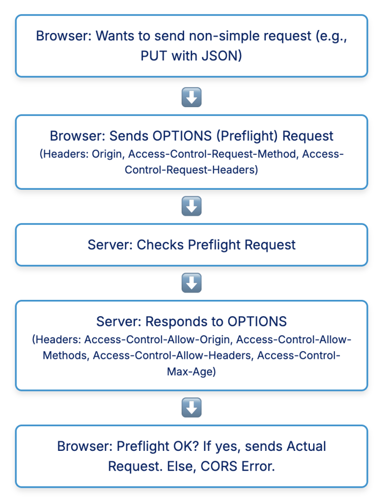 The browser sends this OPTIONS request to determine if the actual request is safe to send. The preflight request includes headers like Access-Control-Request-Method (indicating the intended HTTP method) and Access-Control-Request-Headers (listing any custom headers that will be used in the actual request). The server then responds with its own CORS headers, such as: